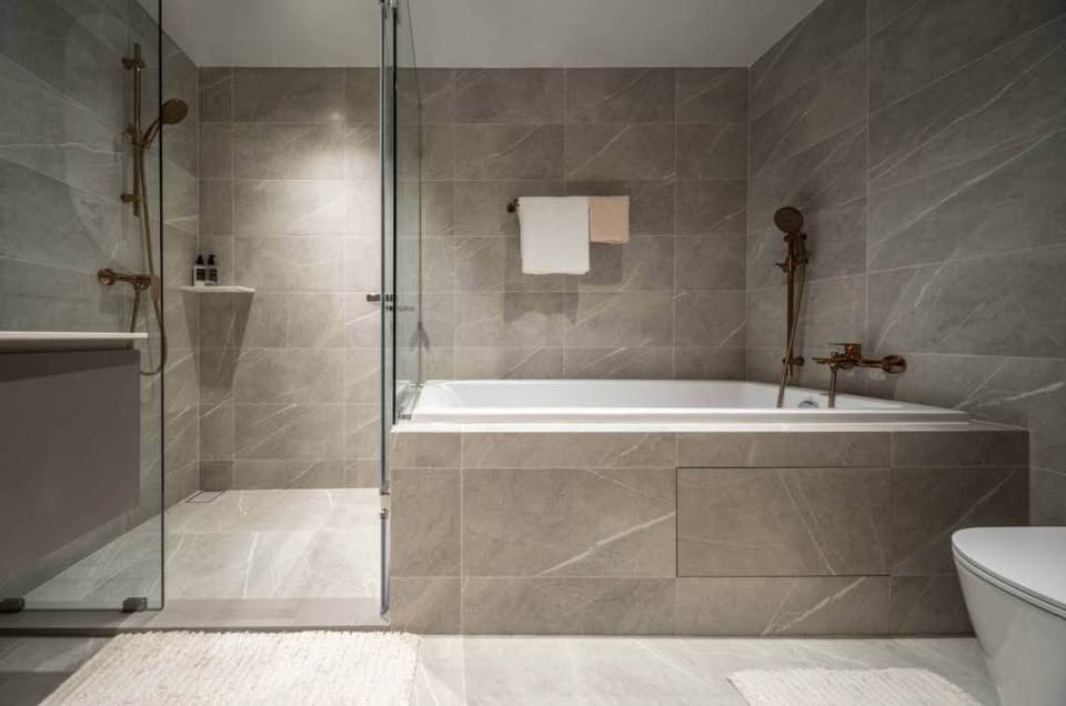 Master bathroom with bathtub